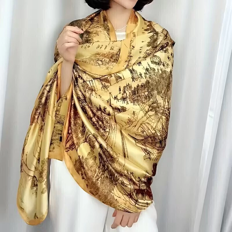 Um lenço em cetim dourado com estampa de paisagem oriental clássica, em tons quentes e terrosos que refletem o charme da luz solar do fim de tarde. Sofisticado e fluido, transforma qualquer look com um toque de arte e elegância.